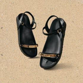 A sporty open-toe sandal with pink adjustable straps, a gray cushioned mesh footbed, and a sturdy black rubber sole — blending comfort, durability, and playful style.