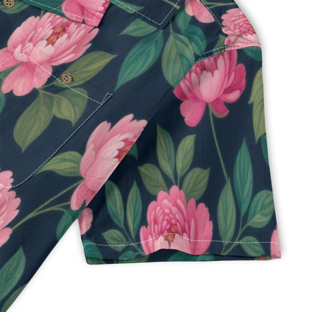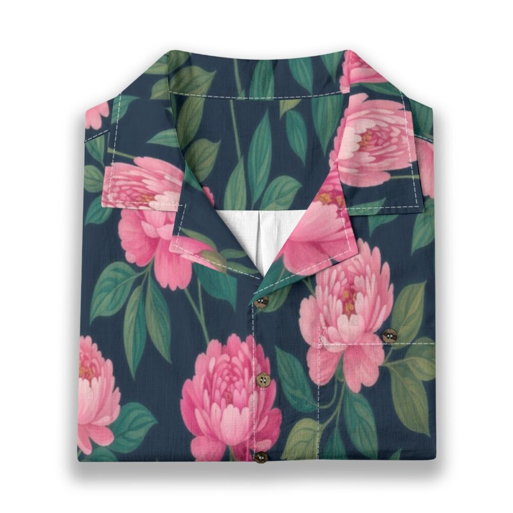 Lush peonies bloom across a rich navy base, creating a bold yet refined pattern. Soft pink petals contrast beautifully, bringing depth and elegance to the design.