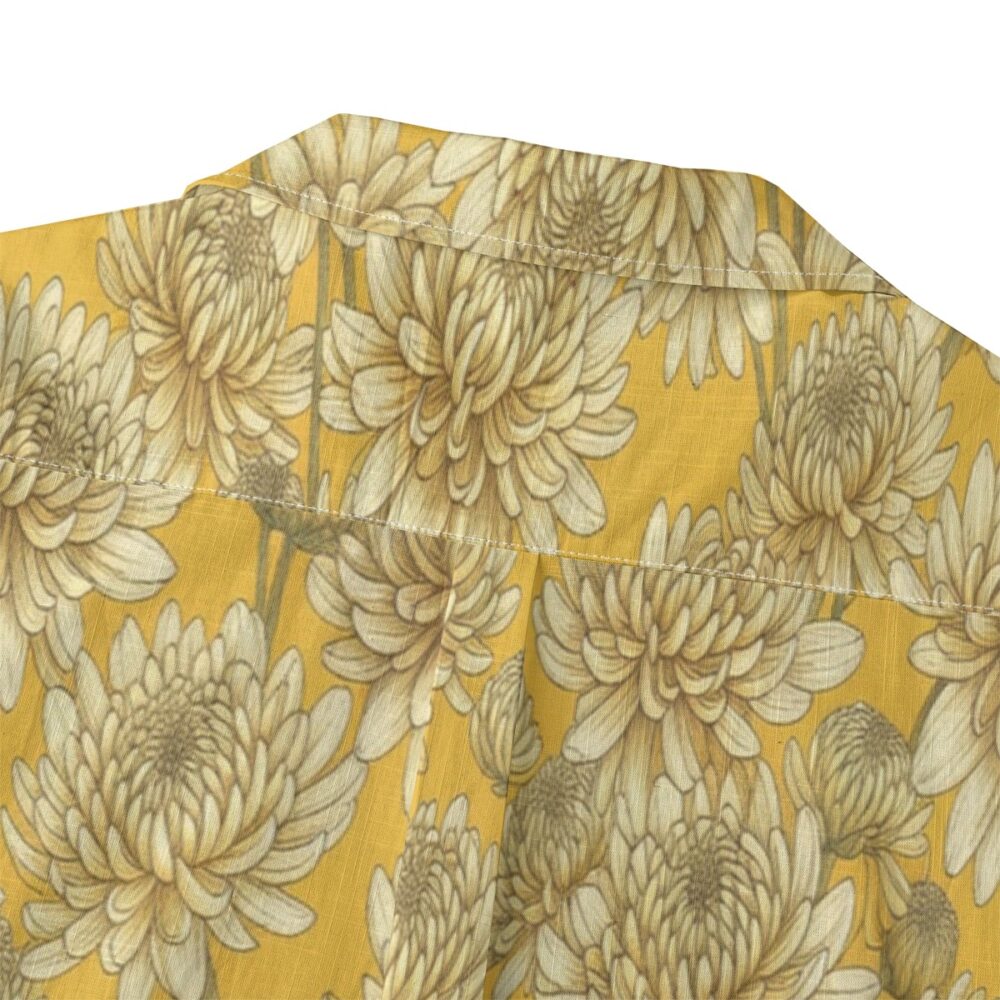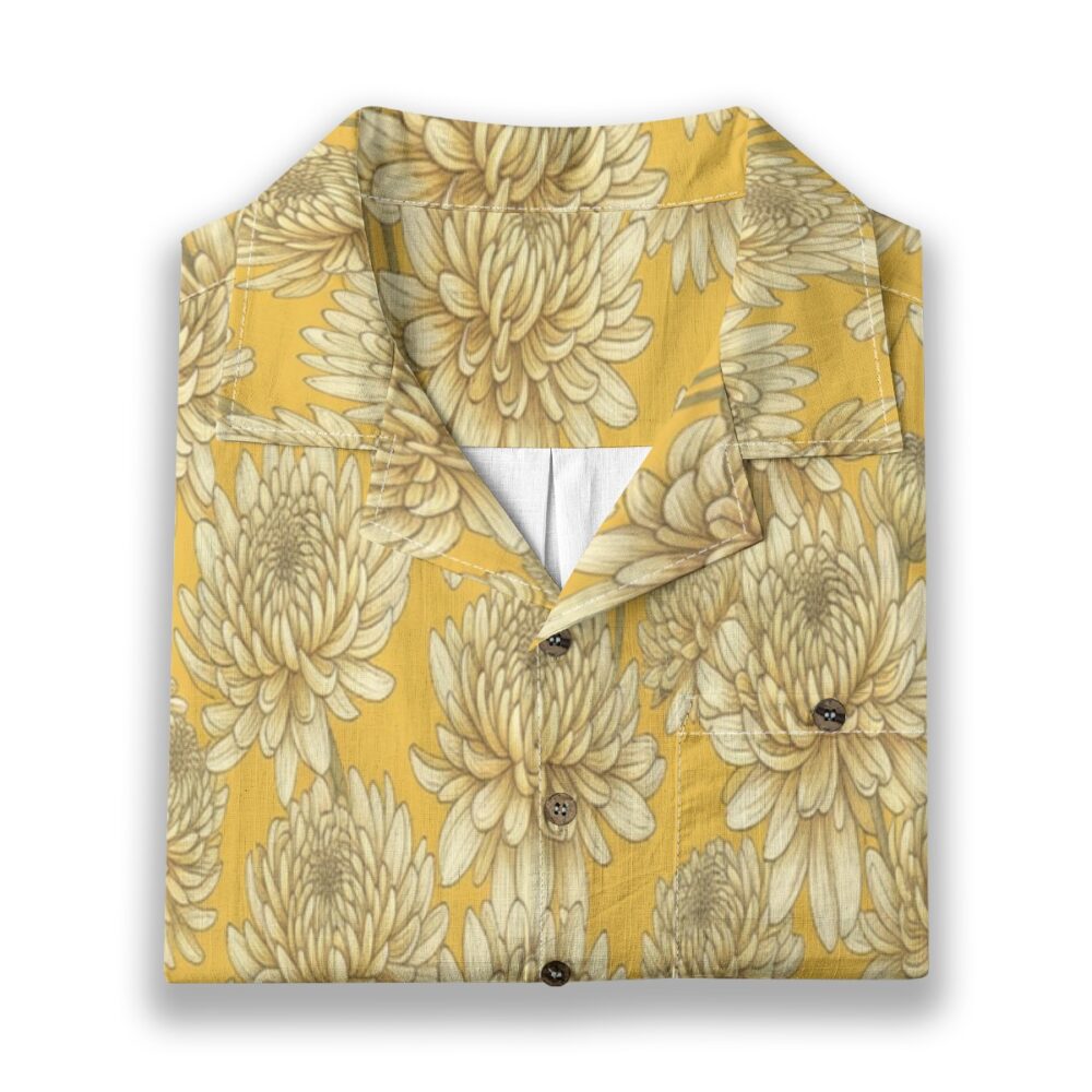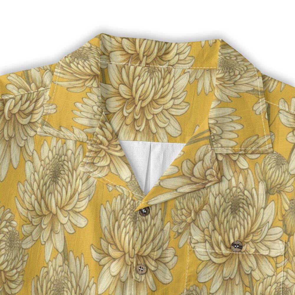 Layered chrysanthemum petals form a rich, textured pattern filled with warmth. Golden hues create a bright and radiant tropical feel.