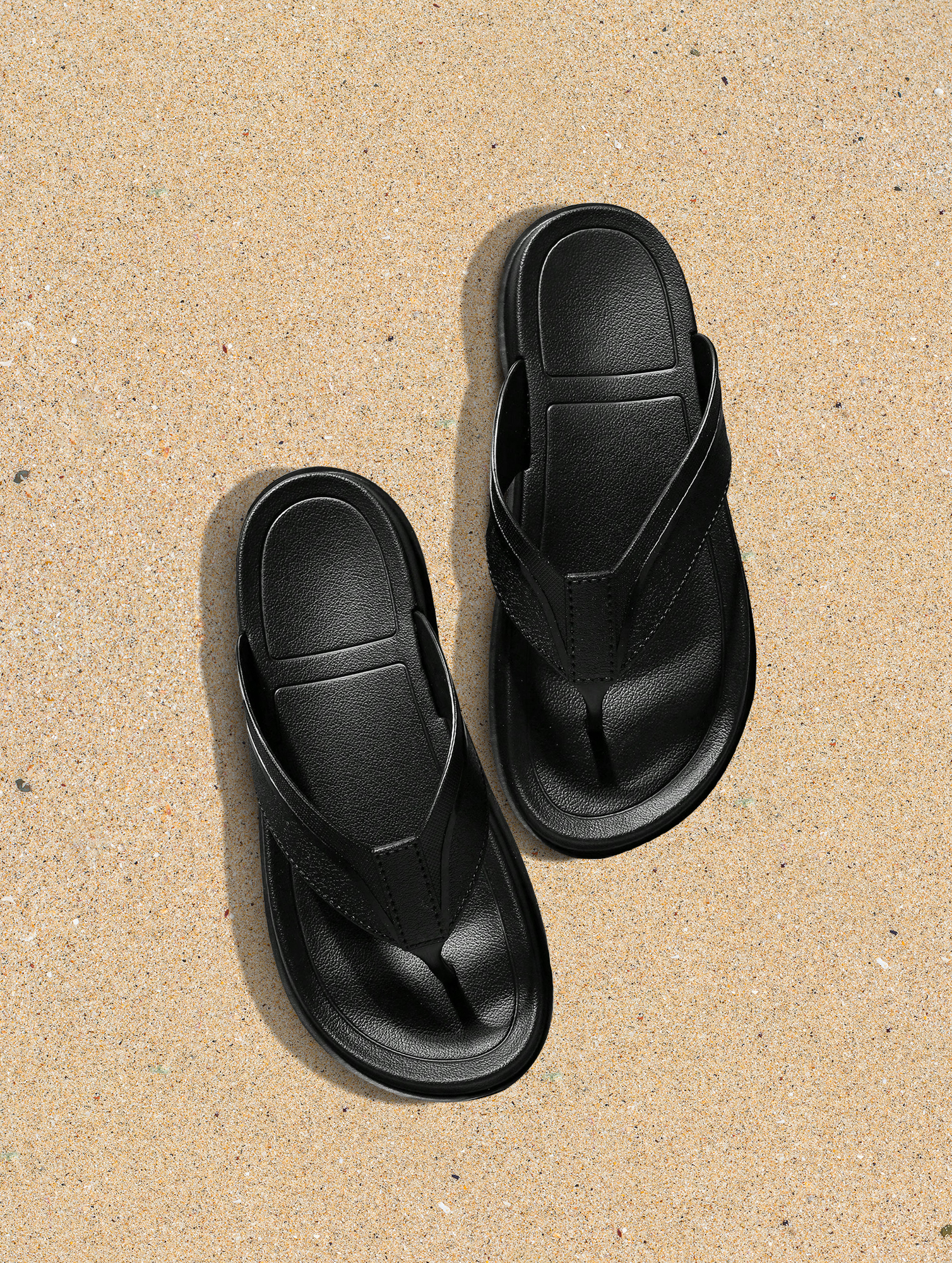 - Sleek black thong sandals for versatile everyday wear.